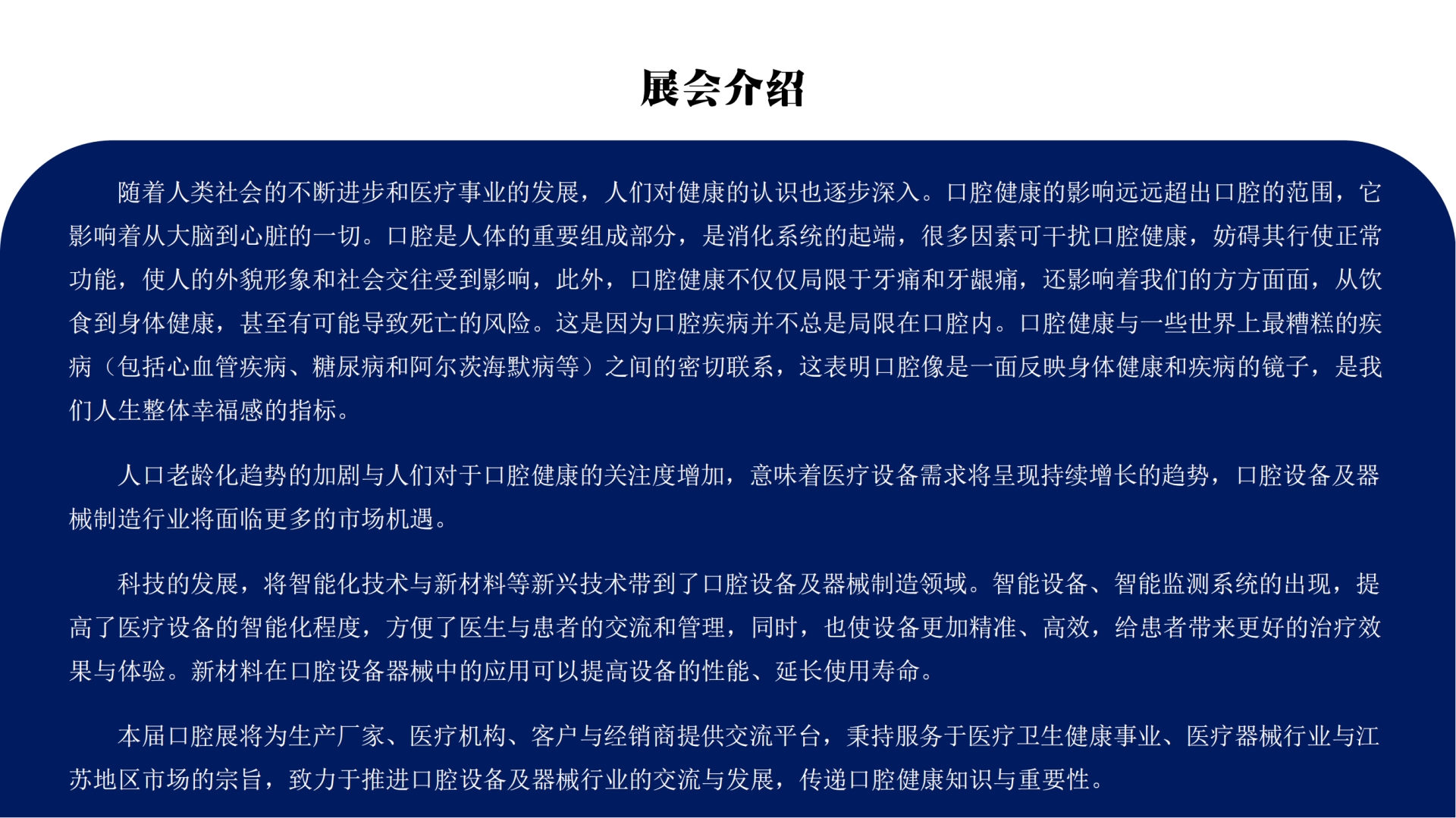 人口老龄化趋势的加剧与人们对于口腔健康的关注度增加,意味着医疗设备需求将呈现持续增长的趋势,口腔设备及器械制造行业将面临更多的市场机遇。科技的发展,将智能化技术与新材料等新兴技术带到了口腔设备及器械制造 领域。智能设备、智能监测系统的出现,提高了医疗设备的智能化程度,方便了 医生与患者的交流和管理,同时,也使设备更加精准、高效,给患者带来更好的 治疗效果与体验。新材料在口腔设备器械中的应用可以提高设备的性能、延长使用寿命。本届口腔展将为生产厂家、医疗机构、客户与经销商提供交流平台,秉持服 务于医疗卫生健康事业、医疗器械行业与江苏地区市场的宗旨,致力于推进口腔设备及器械行业的交流与发展,传递口腔健康知识与重要性。