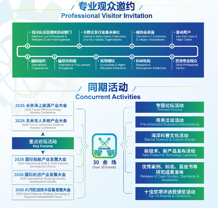 本届展会设五大主题子展、十一大专业展区,涵盖船艇设备、海上能源、无人系统等领域,将开展 30 余场专业论坛与商贸对接活动。上届展会吸引 812 家展商、19 万人次参观,是海洋装备产业产学研合作、经贸对接的核心平台。