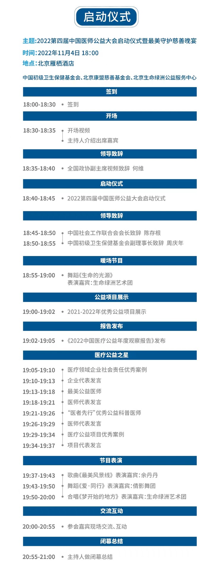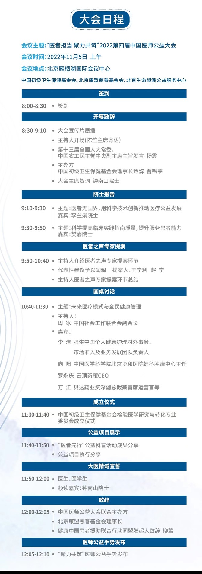 2022第四届中国医师公益大会上,将进行“医者先行”公益科普活动成果分享、及其他公益项目执行分享,大会主席钟南山院士将与众多公医师共同进行“大医精诚”宣誓,秉承“大医精诚之心”,敬佑生命、救死扶伤、甘于奉献、大爱无疆。同时,为号召更多医师参与医疗公益,大会现场将发布“医师公益手势”,汇聚仁者之心,撑起健康未来。医师们将继续积极践行医疗公益事业,“医”心向党、踔厉奋发,不断提升医德医术,切实增强服务本领,努力为人民群众提供更加优质高效的公益慈善服务。